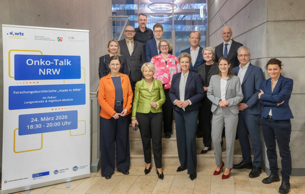 Zum vierten Mal haben das Centrum für Integrierte Onkologie (CIO) Köln und das Westdeutsche Tumorzentrum (WTZ) Essen – gemeinsam mit dem Ministerium für Kultur und Wissenschaft (MKW) des Landes Nordrhein-Westfalen – zum „Onko-Talk NRW“ eingeladen. Rund 150 Teilnehmerinnen und Teilnehmer kamen am 24. März 2026 im Lehr- und Lernzentrum der Universitätsmedizin Essen zusammen, um über aktuelle Entwicklungen in der Lungenkrebsmedizin zu diskutieren.